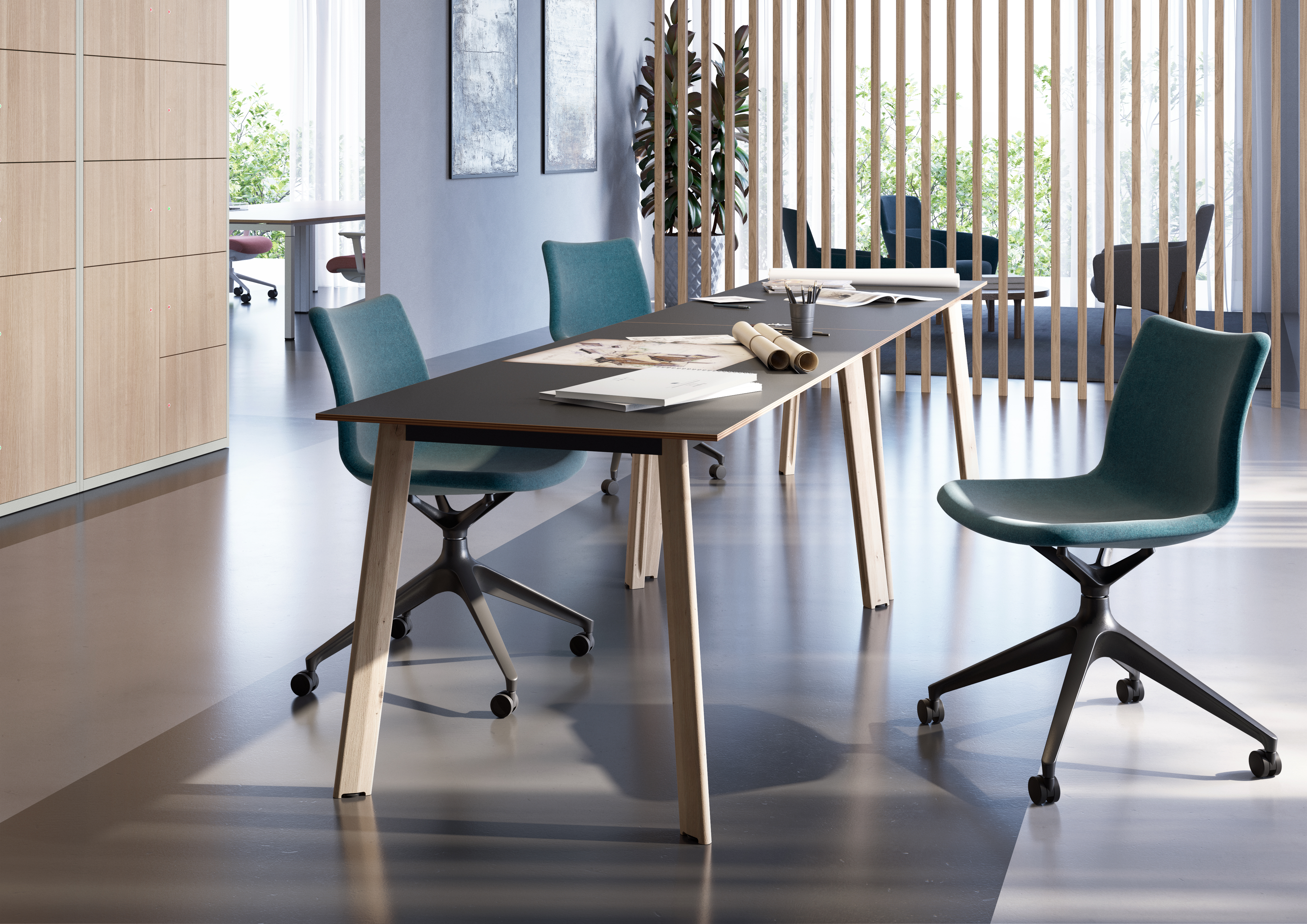 Sleek, sturdy, and versatile mobile project tables, the Evie collection is as agile as it is flexible.